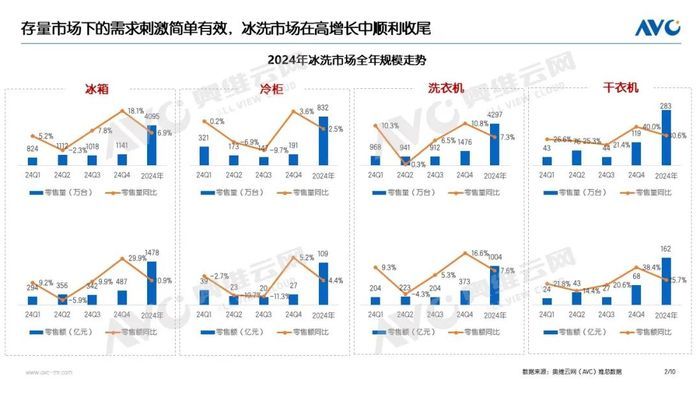 縱觀2024年,中國冰洗市場經(jīng)歷了較大的規(guī)模起伏,以四季度的高增長迎來順利收官。奧維云網(wǎng)(AVC)全渠道推總數(shù)據(jù)顯示,冰洗市場整體零售額為2753億元,同比增長9.7%,零售量為9508萬臺,同比增長6.7%。從全年銷售節(jié)奏看,這一增長主要依托于國補(bǔ)政策的加持。政策刺激下,潛在換新需求得到了充分釋放,同時,補(bǔ)貼力度也對產(chǎn)業(yè)內(nèi)的結(jié)構(gòu)升級起到了積極的助推作用。