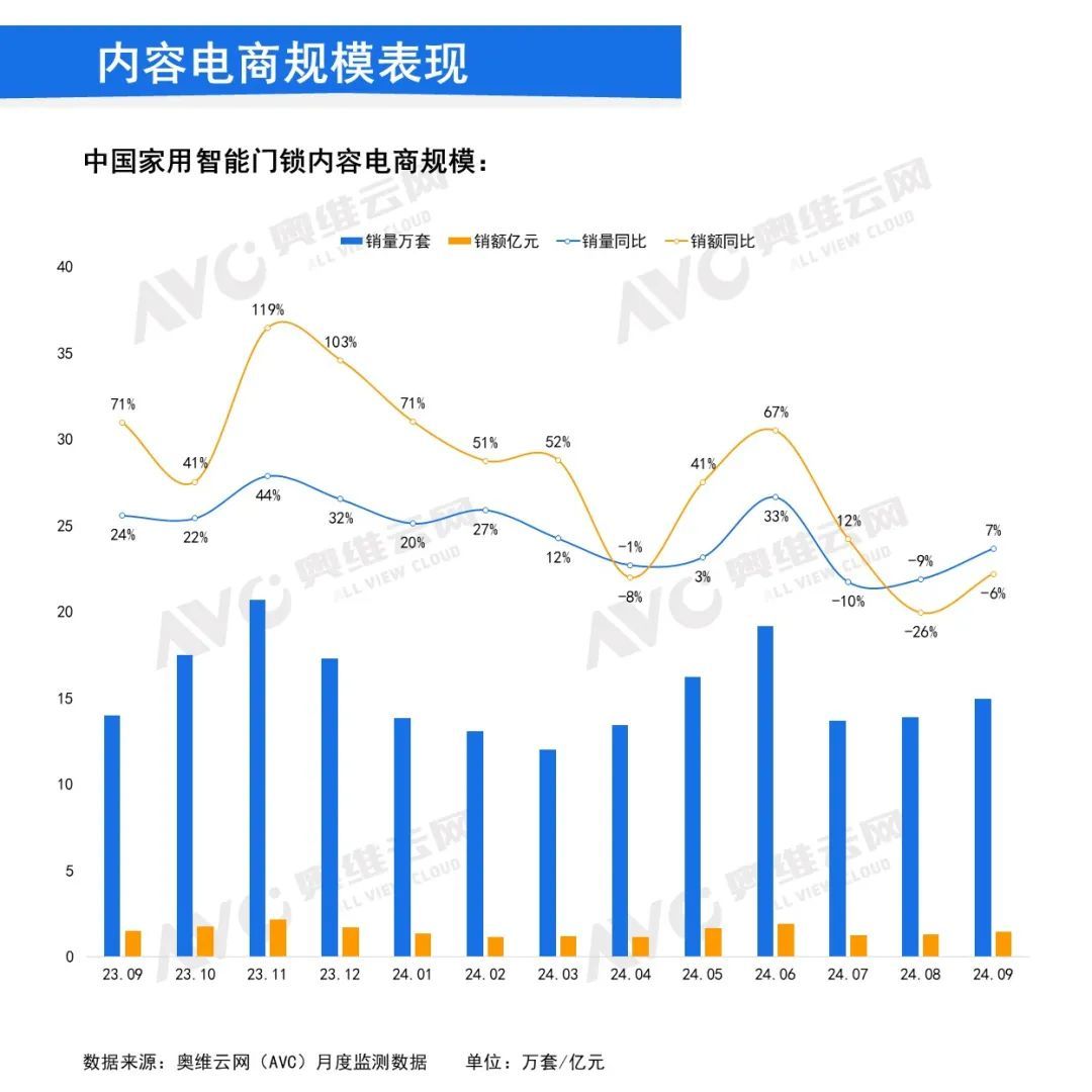 奧維云網(wǎng)(AVC)《2024年9月中國(guó)家用智能門鎖線上市場(chǎng)總結(jié)報(bào)告》顯示,9月內(nèi)容電商智能門鎖品類的需求提升,零售量規(guī)模同比去年9月增長(zhǎng)7%。零售額規(guī)模同比下降6%,但對(duì)比8月零售額表現(xiàn)來看,9月降幅收窄。