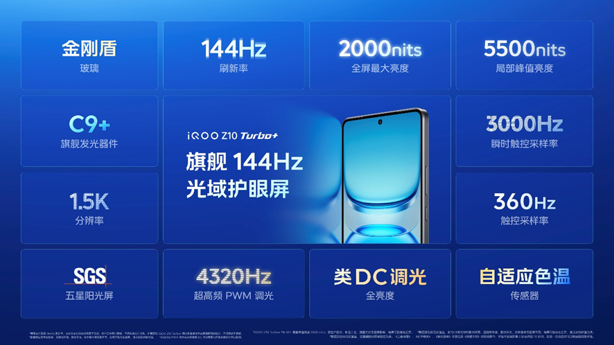電競(jìng)視界超能視效,為電競(jìng)造神屏。iQOO Z10 Turbo+ 搭載旗艦 144Hz 光域護(hù)眼屏,采用華星旗艦 C9+ 發(fā)光器件,憑借屏幕三重鎖電技術(shù)實(shí)現(xiàn)屏幕功耗大幅降低的同時(shí),實(shí)現(xiàn) 2000nit 全局最大亮度和 4400nit 25% APL(多場(chǎng)景)局部峰值亮度,更有獨(dú)立電源管理 IC,即使電量低至 20%,屏幕亮度依然穩(wěn)如泰山;還具備默認(rèn)低亮度 PWM 調(diào)光/高亮度類 DC 調(diào)光、4320Hz 超高頻 PWM 調(diào)光和全亮度類 DC 調(diào)光,護(hù)眼水準(zhǔn)同樣很旗艦。
