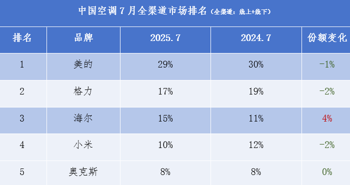 奧維云網(wǎng)最新發(fā)布的2025年7月全渠道(線上+線下)空調(diào)銷量數(shù)據(jù),清晰展現(xiàn)了頭部品牌的份額變動(dòng)。其中,美的以29%的份額位居榜首,較2024年同期微降1個(gè)百分點(diǎn);格力以17%的份額位列第二,同比下滑2個(gè)百分點(diǎn);海爾以15%的份額占據(jù)第三,同比提升4個(gè)百分點(diǎn)。在市場(chǎng)前三甲中,海爾成為唯一實(shí)現(xiàn)份額同比正增長(zhǎng)的品牌。