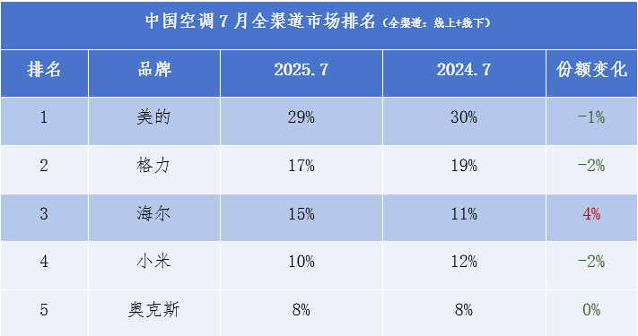 據(jù)奧維云網(wǎng)7月份全渠道(線上+線下)空調(diào)銷量數(shù)據(jù)。數(shù)據(jù)顯示,空調(diào)行業(yè)前三甲依然是:美的29%,同比份額-1%;格力17%,同比份額-2%;海爾15%,同比份額4%。,為TOP3中唯一份額正增。