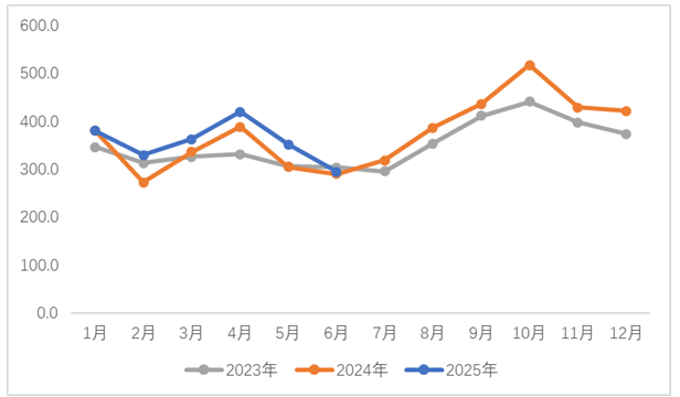2023年-2025年6月洗衣機(jī)行業(yè)內(nèi)銷月度季節(jié)特征(萬臺(tái))