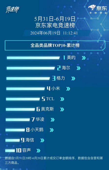 丁科技網(wǎng)注意到,從京東家電競速榜(5月31日-6月19日)來看,全品類累積成交額TOP10品牌分別為:美的、海爾、格力、小米、TCL、奧克斯、華凌、小天鵝、海信、容聲。