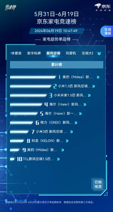 結(jié)合京東618榜單以及奧維云網(wǎng)等機(jī)構(gòu)數(shù)據(jù)來看,小米空調(diào)已經(jīng)完全“起勢”,將成為空調(diào)行業(yè)格局再造的關(guān)鍵力量。丁科技網(wǎng)注意到,在家電趨勢單品榜(5月31日-6月19日)新風(fēng)空調(diào)累計(jì)榜單中,Top10單品小米空調(diào)占據(jù)了3席,其中有2席位居二、三位。美的空調(diào)、格力空調(diào)、海爾空調(diào)上榜的新風(fēng)空調(diào)產(chǎn)品分別為2款、2款、1款??梢钥吹?,在新風(fēng)空調(diào)這個(gè)行業(yè)最熱門的領(lǐng)域,小米也已經(jīng)具備了打造爆品矩陣的能力。