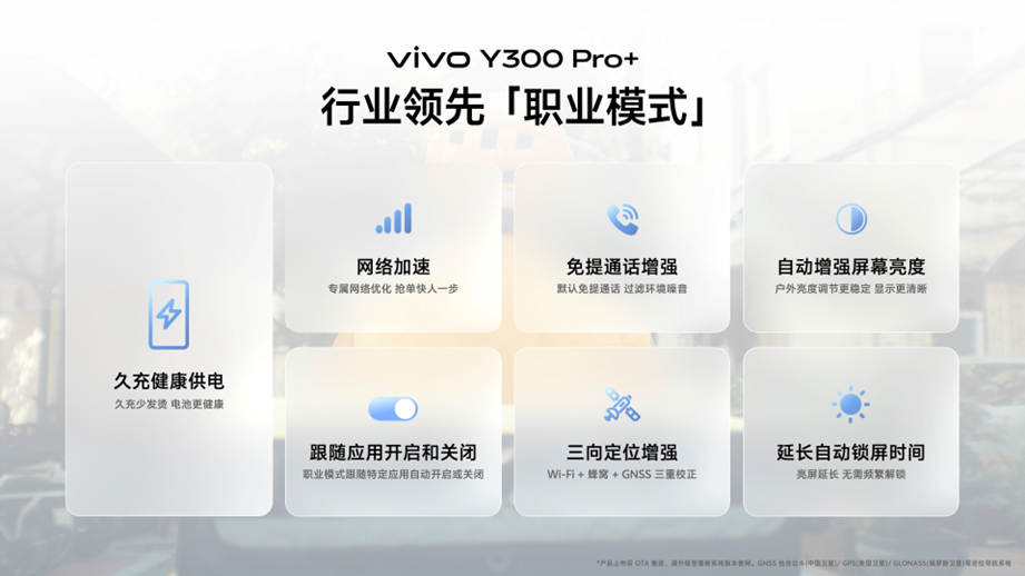 vivo Y300 Pro+搭載流暢穩(wěn)定的OriginOS 5系統(tǒng),原子島、小V圈搜、小V寫(xiě)作等多種好用功能,讓工作生活便捷高效。全新升級(jí)的職業(yè)模式加入了司機(jī)職業(yè),支持久充健康供電,手機(jī)運(yùn)行更流暢;升級(jí)的網(wǎng)絡(luò)加速功能,可有效降低延遲并提高搶單成功率;更有三向定位增強(qiáng)功能,提供高精度導(dǎo)航定位,全面優(yōu)化使用體驗(yàn),為特定職業(yè)人群提供強(qiáng)大助力,提升工作效率。