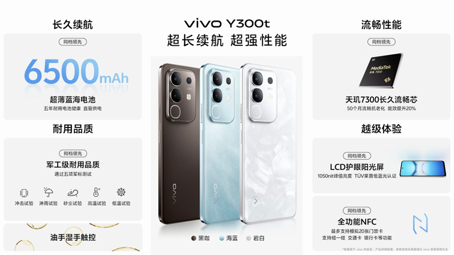 同時(shí)發(fā)布的還有全新vivo Y300t,其搭載6500mAh耐用藍(lán)海電池、支持久充健康供電功能,提供行業(yè)領(lǐng)先的續(xù)航體驗(yàn);配備天璣7300處理器,可保持50個(gè)月流暢使用;通過(guò)多項(xiàng)軍標(biāo)測(cè)試,更擁有磐石抗摔結(jié)構(gòu)、IP64防塵防水,整機(jī)耐用可靠;1050nit超高亮度LCD陽(yáng)光屏,日光下高亮清晰,暗光無(wú)頻閃更護(hù)眼;配齊全功能NFC與紅外遙控,同時(shí)還提供職業(yè)模式功能,滿足用戶多元化需求。
